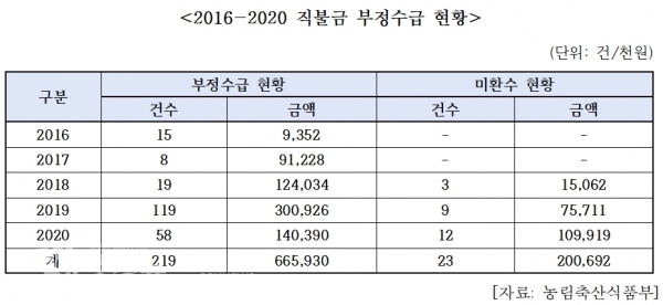 미환수 금액도 2억원 넘어, 공익직불제 시행 이후 올해도 17건 적발