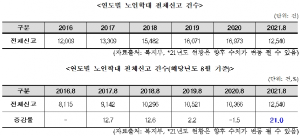 같은 기간 기준으로 살펴보면, 노인학대 전체 신고접수는 지난해 8월 1만366건, 올해 8월 12540건으로 작년 대비 약 21% 증가한 것이다.