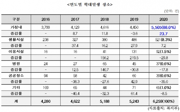 지난해 노인학대 사례 6259건의 학대발생 장소 중 가정 내에서 발생한 학대건수는 5505건으로 88%를 차지했다. 코로나 발생 이전인 2019년 대비 약 24%가 증가했다. 이는 코로나19 방역조치로 인한 시설 이용의 제한이 영향을 끼친 것으로 보인다.