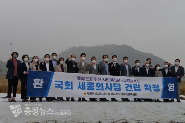 세종특별자치시의회 행정수도완성특별위원회(위원장 유철규, 이하 행수특위)는 6일 국회 세종의사당 후보지를 찾아 국회 세종의사당 건립 확정을 기념하는 퍼포먼스를 펼쳤다.
