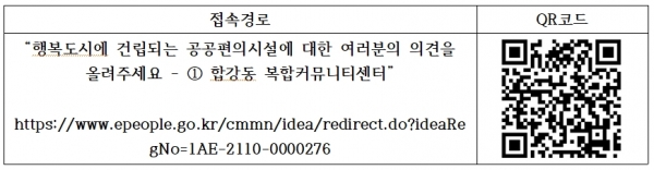 국민참여 정책플랫폼인 ‘국민생각함’을 통해 8일부터 11.20(토)까지 40일간 설계 진행 중인 4개 사업의 합강동(5-1생)·집현동(4-2생)·산울동(6-3생) 복합커뮤니티센터, 평생교육원 설계공모 당선작을 중심으로 건축물 디자인 및 내부 공간 구성 등에 대해 소개하고, 만족도와 건의사항 등을 5문항으로 설문한다.