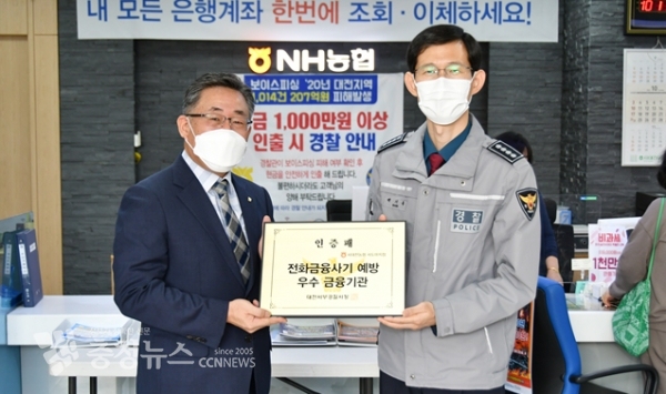 대전서부경찰서는 14일 이른바 보이스피싱을 막는 데 큰 공을 세운 서대전농협 서도마지점을 ‘전화금융사기 예방 우수 금융기관’으로 선정하고 인증패 및 경찰서장 감사장을 수여했다.