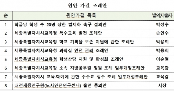 박용희 의원이 대표 발의한 ‘세종특별자치시교육청 응급처치교육 지원 조례안’의 경우 응급처치교육 행위 주체와 이를 지원하는 교육감의 역할을 구분해 명시하고 민간 위탁 근거 조항을 신설했다. 또한 박용희 의원이 대표 발의한 ‘세종특별자치시교육청 교육균형발전 지원 조례안’에서 교육균형발전위원회의 위촉위원 대상자를 수정하고 실무위원회 구성‧운영 사항을 규칙으로 정하도록 수정 가결했다.