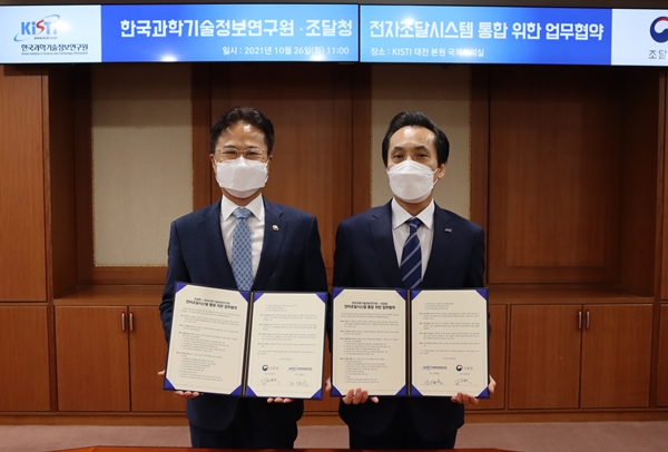 한국과학기술정보연구원(KISTI)과 조달청이 전자조달시스템 통합 등 조달분야 협업 강화를 위한 업무협약을 26일 체결했다.