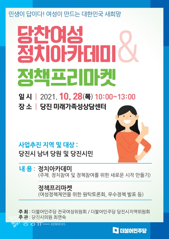 이날 정치아카데미&정책프리마켓는 민주당 전국여성위원회, 당진시 지역위원회가 주최하고 당진시의회 최연숙 의원이 주관하며, 당진시민 및 지역당원 누구나 참석이 가능하다.