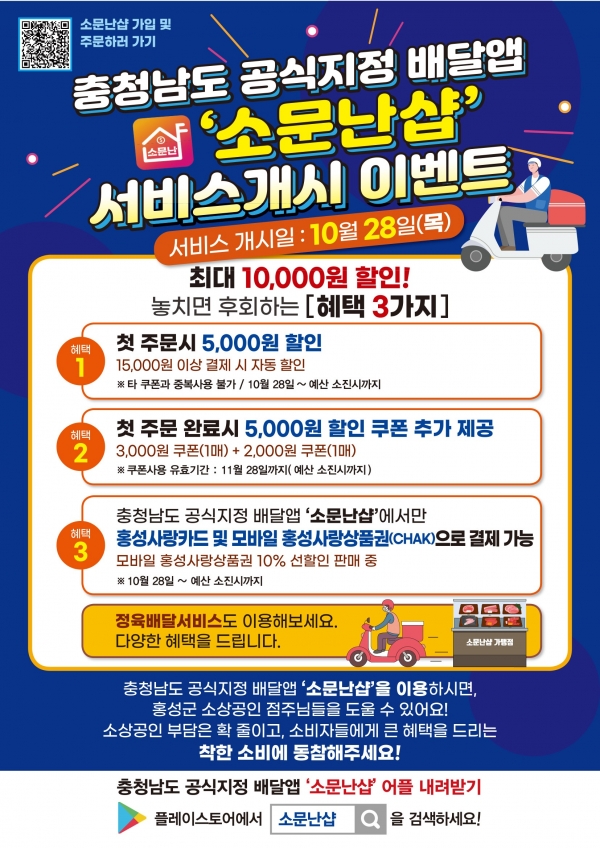 홍성군이 28일부터 충남형 배달앱 ‘소문난 샵’서비스를 시작한다.