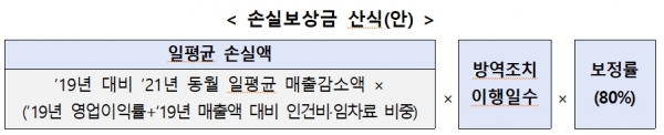 손실보상은 개별업체 손실 규모에 비례해 맞춤형으로 지급하며, 코로나19 영향이 없었던 2019년 동기간에 견줘 2021년 7∼9월 동안 집합금지·영업제한으로 영업이익 감소분에 방역조치 이행기간과 보정률을 적용해 산정한다.