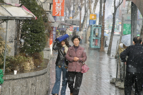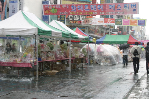연인들이 손꼽아 기다리는 '화이트데이' 를 하루 앞둔 13일, 영하 7도의 매서운 꽃샘추위 속에 눈까지 내리면서 거리마저 꽁꽁 얼어붙었다.