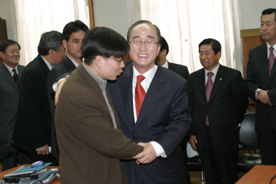 | ▲ 기자회견을 마치고 심대평도지사가 관계자를 격려하며 환하게 웃고 있다. | ||