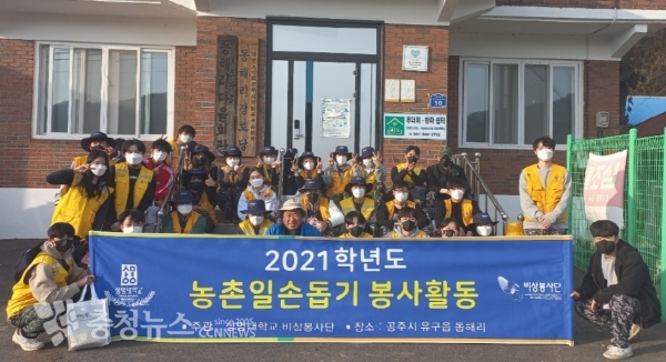 [충청뉴스 최형순 기자] 상명대학교(총장 홍성태) 천안캠퍼스 비상봉사단은 5일 공주시 유구읍 동해리 일대에서 농촌일손돕기 봉사를 펼쳤다. 오는 12일은 2차 농촌일손돕기 봉사활동을 펼칠 계획이다.