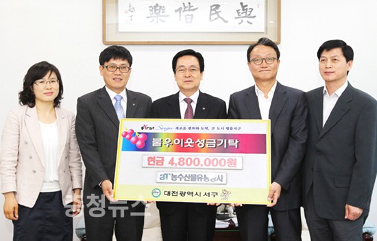 사회복지공동모금회 지정 기탁해 저소득 취약계층 위해 농수산물유통공사 대전충남지사(지사장 이공우)는 18일 서구청을 방문, 박환용 서구청장에게 이웃돕기성금 480만원을 전달했다. ▲ 농수산물유통공사 대전충남지사가 박환용 서구청장에 성금을 기탁했다. 이번에 전달 받은 성금은 사회복지공동모금회에 지정 기탁해 서구 관내 소년소녀가장 등 저소득 취약계층을 위한 불우이웃돕기에 쓰일 예정이다 저작권자 © 충청뉴스 무단전재 및 재배포 금지 이재용 기자 다른기사 보기 기사가 마음에 드셨나요? 충청뉴스 좋은 기사 후원하기 1,000원 3,000원 5,000원 10,000원 30,000원 50,000원 직접입력 비회원 약관동의하기 ※ 소중한 후원금은 더 좋은 기사를 만드는데 쓰겠습니다.