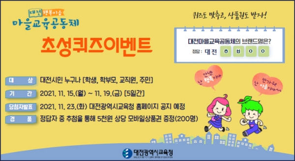 지난 8월에 이어 두 번째로 실시하는 퀴즈 이벤트는 학생, 학부모, 교직원, 마을주민 등 대전 시민이면 누구나 참여할 수 있으며, 정답자 중 200명을 추첨하여 5천원 상당 모바일상품권을 제공할 예정이다.