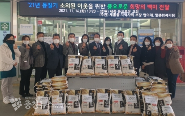 [충청뉴스 최형순 기자] 세종특별자치시 새롬동 세종풍요로운교회(담임목사 최재현)가 16일 새롬동 지역사회보장협의체(공동위원장 김산옥·강영운)에 백미 10㎏ 50포와 이웃돕기 성금 150만 원을 기탁했다.