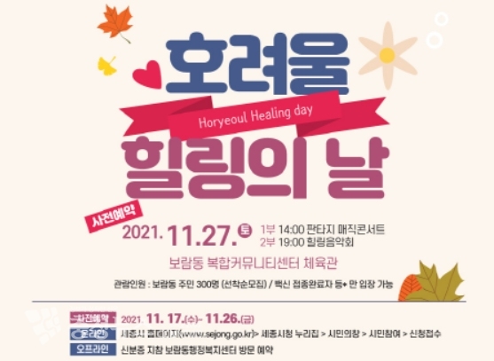 [충청뉴스 최형순 기자] 세종특별자치시 보람동행정복지센터(동장 강민규)가 코로나19 단계적 일상회복 전환기를 맞아 오는 27일 지역문화행사 ‘호려울 힐링의 날’을 개최한다.