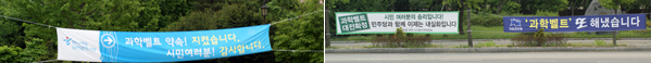 대전시내 곳곳에는  과학벨트 유치관련 한나라당 '약속을 지켰습니다', 민주당·선진당 '또 해냈습니다'라고 쓴 현수막이 걸려있다.