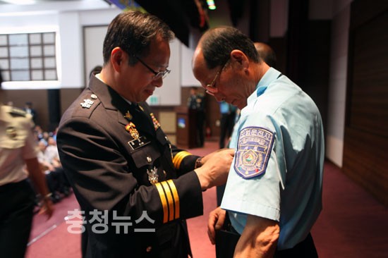 ▲ 김기용 충남경찰청장이 교통삼색장을 수여하고 있다.