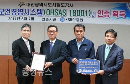 대전도시철도공사가 경영혁신, 품질, 환경분야등에 걸친 국제표준화 인증기관인 KSR인증원 및 KAB(한국인정원)로부터 안전보건경영시스템(OHSAS 18001) 인증을 받았다고 8일 밝혔다.