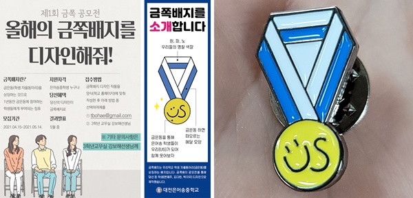 왼쪽부터 금쪽 공모전 포스터, 선정 작품 소개, 제작된 배지 실물