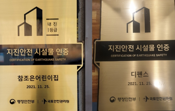 [충청뉴스 최형순 기자] 세종특별자치시(시장 이춘희) 내 아름동 참조은어린이집과 조치원읍 카페디펜스 등 2곳이 지진에 견딜 수 있는 내진성능이 확보된 시설물에 부여하는 ‘지진안전 시설물 인증’을 획득했다.