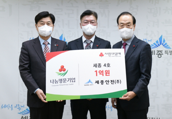 세종안전㈜는 이날 시청 접견실에서 이춘희 시장, 홍영섭 세종사회복지공동모금회장, 이경식 세종안전㈜ 대표이사 등이 참석한 가운데 향후 3년 간 1억 원의 성금을 기부하기로 약정했다.
