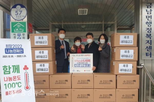 진승기 금남면장은 “세종새마을금고의 마스크 후원으로 어르신들과 저소득 가정 등이 좀 더 안전한 겨울을 보낼 수 있게 되어 진심으로 기쁘다”면서 “아낌없는 후원으로 지역에 기여하는 세종새마을금고 이사장님과 직원들께 진심으로 감사하다”고 말했다.