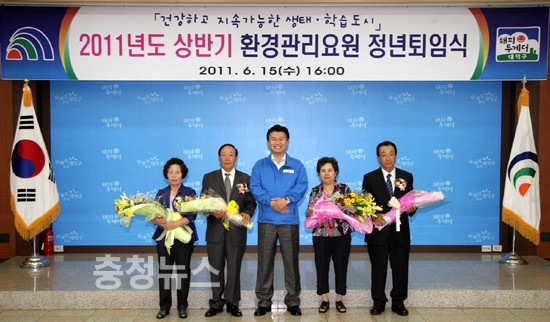 퇴임자는 부부동반산업시찰과 14일간의 특별 휴가 부여 대전 대덕구(구청장 정용기)는 지난 15일 구청 중회의실에서 2011 상반기 환경관리요원 정년퇴임식을 가졌다. ▲ 정용기 구청장과 퇴임자가 함께 기념 촬영을 하고 있다. 이날 행사는 정용기 구청장과 퇴임자가 함께하는 티타임에 이어 공로패수여와 기념사진촬영으로 진행됐으며, 퇴임자에게는 부부동반산업시찰과 오는 17일부터 30일까지 14일간 특별휴가가 주어진다. 저작권자 © 충청뉴스 무단전재 및 재배포 금지 이재용 기자 다른기사 보기 기사가 마음에 드셨나요? 충청뉴스 좋은 기사 후원하기 1,000원 3,000원 5,000원 10,000원 30,000원 50,000원 직접입력 비회원 약관동의하기 ※ 소중한 후원금은 더 좋은 기사를 만드는데 쓰겠습니다.