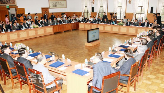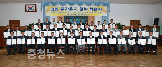 안희정 도지사는 천안ㆍ보령ㆍ아산ㆍ청양ㆍ예산ㆍ당진 시장 및 군수와 함께 (주)운영 등 40개 기업과 도내 이전을 위한 투자협약(MOU)을 21일 도청 대회의실에서 체결했다.