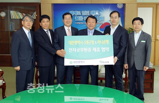 대전시는 22일 오전 시청에서 염홍철 대전시장을 비롯한 박종덕 충청하나은행 대표 등 관계자들이 참석한 가운데 ‘대전시청 및 5개 구청 전자공무원증 발급’을 위한 업무협약을 체결했다.
