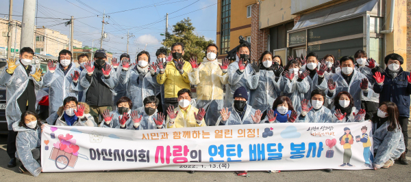 15일 아산시의회 따르면 13일 아산시의회 의원들과 사무국 직원 30여 명은 양손에는 코팅장갑을 몸에는 우의를 입고 영하의 강추위 속에서도 연탄 400장을 직접 배달하며 이웃사랑을 위해 구슬땀을 흘렸다.