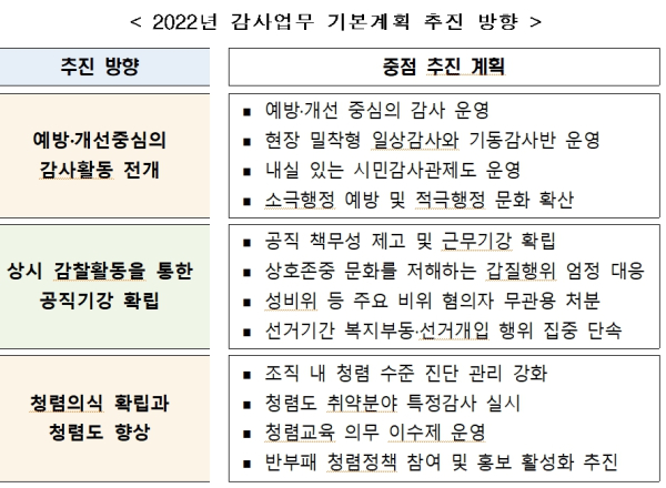 학교현장을 실질적으로 지원하고 소통하는 예방·개선 중심의 종합감사를 운영하고, 신속ㆍ창의ㆍ유연한 교육행정을 바탕으로 일하는 공직 분위기를 조성하고, 학생, 학부모 등 교육공동체가 실질적으로 체감할 수 있는 적극행정 활성화에 주력한다.