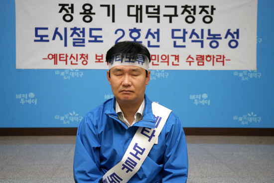 정용기 대덕구청장이 대전시의 도시철도 2호선 예비타당성 조사 신청을 저지하기 위해 28일 대덕구청 중회의실에서 단식농성에 들어갔다.