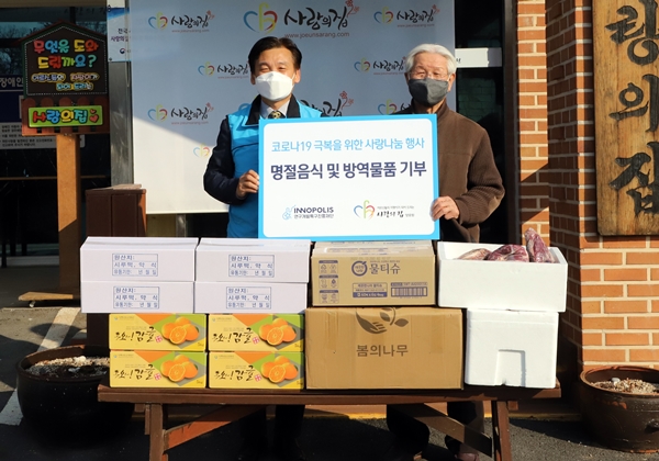 특구재단은 이날 사랑의집에 60명분의 떡국재료와 제철과일, 손 세정제 및 마스크 등을 코로나19 방역지침에 따라 안전하게 전달했다.