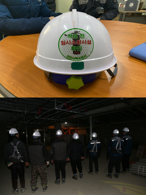 스티커 부착을 통해 작업자가 안전모를 쓰기 전 임시소방시설 설치의 필요성을 환기시키고, 고휘도 반사 재질로 부주의 안전사고를 방지해 겨울철 공사장 화재예방에 기여할 것으로 보인다.