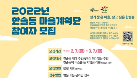 이 밖에 주민총회로 최종사업을 결정하고 내년도 예산에 반영해 실행하게 된다. 신청 자격은 모집일 기준 한솔동 내 주민등록이 되어 있는 주민 또는 한솔동 내에 주소를 둔 사업장 직원이다.