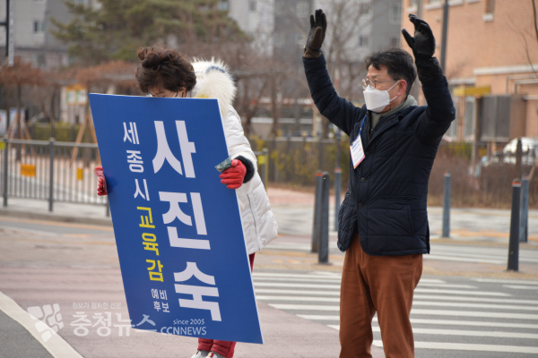 [충청뉴스 최형순 기자]  사진숙 세종시교육감 예비후보는 15일 출퇴근 시간에 보람동 남부경찰서 사거리에서 시민들께 가두 인사로 선거운동에 나섰다.