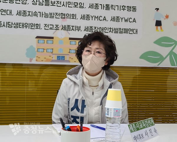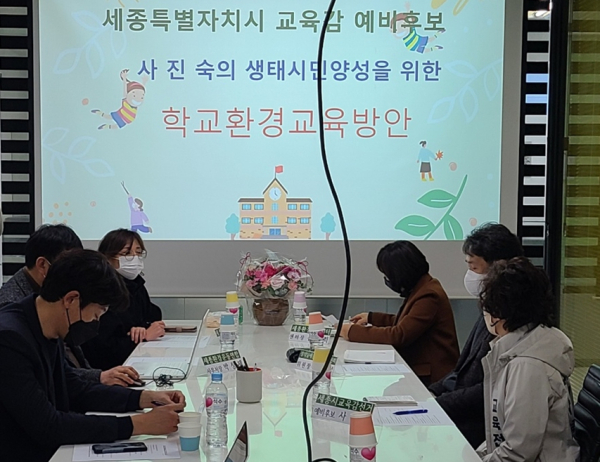 [충청뉴스 최형순 기자] 세종시교육감 선거에 출마한 사진숙 예비후보는 16일, 자신의 선거사무실에서 환경생태교육정책간담회를 갖고 ‘생태시민양성을 위한 학교환경교육 방안’을 논의했다.