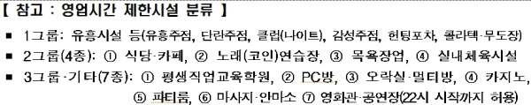 평생직업교육학원, PC방, 오락실‧멀티방, 카지노, 파티룸 마사지업소‧안마소 등은 22시로 종전 기준이 유지되며, 행사‧집회 종교시설 등에 조치 또한 그대로 유지된다.