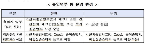 그간 접촉자 추적관리를 위한 출입명부를 활용했으나, 자기기입식 역학조사 도입에 따라 출입명부(안심콜, 수기명부) 의무화를 잠정 중단한다.