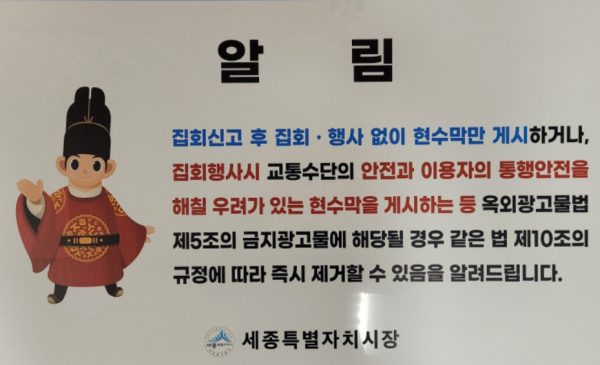 [충청뉴스 최형순 기자] 세종특별자치시(시장 이춘희)가 이달 말부터 어진동 정부청사 일원 집회주요 장소에 집회 현수막 근절을 위한 안내판 56매(90㎝×60㎝)를 부착하고 불법집회현수막 근절에 나선다.