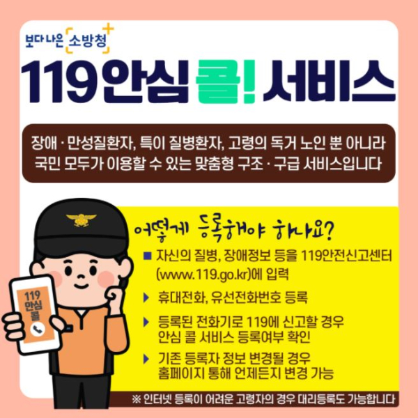 ‘119안심콜서비스’는 국민 누구나 가입 가능하며, 만성질환자 및 홀몸노인 등이 병력 및 복용약물 등을 미리 등록하여 위급상황 발생 시 구급대원이 맞춤형 응급처치와 신속한 병원 이송을 가능하게 하는 시스템이다.