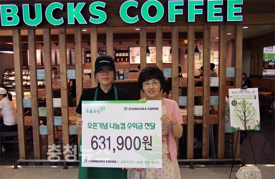 스타벅스커피코리아(대표 이석구)가 12일 월평트레이더스 오픈기념 나눔행사에서 조성된 수익금 631,900원을 어린이재단 대전지역본부(본부장 최명옥)에 전달했다.