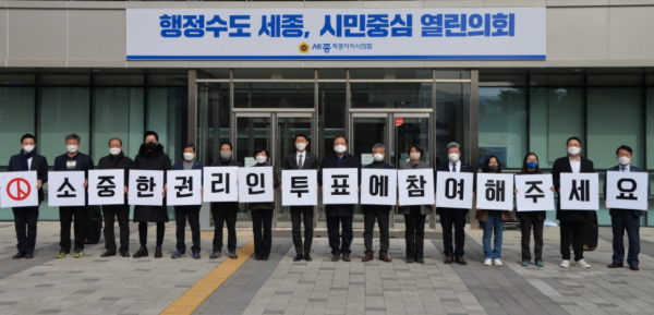 세종시의회 의원 일동은 3월 9일 대통령 선거에서 우리 시가 전국에서 가장 높은 투표율을 기록할 수 있도록 적극적인 투표 참여를 독려했다.