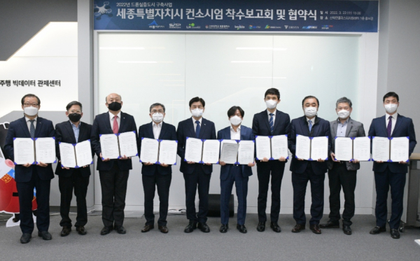 시는 23일 집현동에 위치한 산학연클러스터센터에서 이춘희 시장과 6개 드론기업 대표가 참석한 가운데 드론실증도시 구축 사업 추진을 위한 ‘세종 컨소시엄 협약식’을 개최했다.