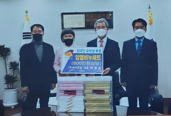 박명금 대표는 "코로나19 등으로 어려움속에서도 대전, 특히 목원대학교에 유학을 와서 공부하는 외국 유학생들에게 작은 정성이지만 대학과 기업이 유학생들과 함께한다"는 마음으로 추진하였다고 밝혔다.