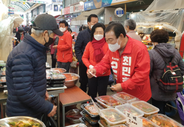 전통시장을 찾은 최민호 세종시장 예비후보는 상인들의 애로 사항을 듣고 지지를 호소했다.