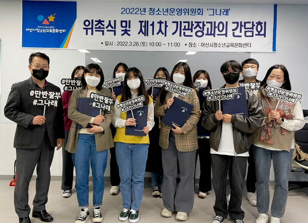 [충청뉴스 박동혁 기자] 아산시청소년재단(이사장 심장근), 아산시청소년교육문화센터(관장 배정수)는 26일 2022년 청소년운영위원회 '그나래' 13기 위원 위촉식을 가졌다.