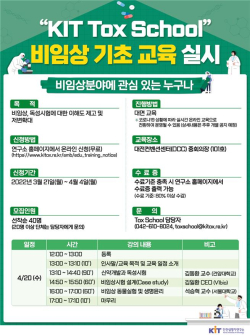 이번 ’KIT Tox School’은 상·하반기로 나눠 비임상 전반에 대한 개론 수준의 기초 과정(대면교육)과 국가과학기술인력개발원(KIRD)의 플랫폼을 활용한 심화 과정의 온라인 교육으로 이루어질 계획이다.
