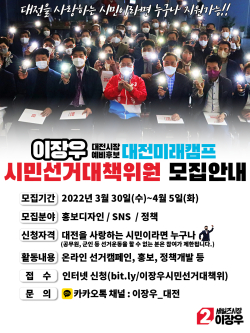 이장우 예비후보 대전미래캠프는 이를 통해 정책에서 소외된 시민이나 지역이 없도록 할 계획이다. 출향인사를 비롯, 대전의 미래를 함께 걱정하며 기여하고 싶은 타지역이나 해외 인사도 참여할 수 있다.
