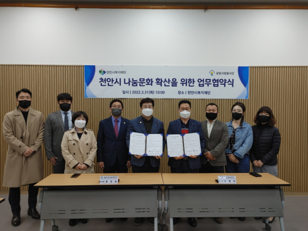[충청뉴스 박동혁 기자] 천안시복지재단은 31일 달빛사랑봉사단과 천안시 나눔문화 확산을 위한 업무협약을 체결했다.