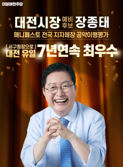 [충청뉴스 성희제 기자] 더불어민주당 장종태 대전시장 선거 예비후보가 서구청장으로서‘7년 연속 공약이행평가 최우수(SA) 등급’을 받았다.